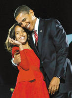 隨著台上傳來“歡迎下任總統一家”的聲音,歐巴馬與妻子米歇爾手挽兩個女兒走上演講台,一家人身穿黑色和紅色服裝,歐巴馬系一條紅色有條紋領帶。