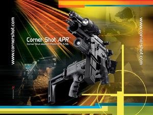 最新的“拐角射擊”系統安裝上一把AR式的半自動“手槍”,稱為Corner Shot APR。雖然所安裝的AR式手槍的槍管較短,但總算是有了接近突擊步槍的火力,然而卻仍然只能半自動射擊,因為向側面進行全自動射擊的時,後坐力是從一側傳向另一側,不能通過槍托傳遞到射手肩部,射手會較難控制。也許“拐角射擊”系統研究人員的下一步工作,該是研究一種輕便小巧且有效的後坐緩衝裝置了。