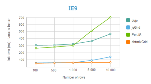 第一次測試,我們讓不同的ajax表格載入 10 列,和不同的行(從100 行到 10,000行)。以下是測試結果。IE9的測試結果: