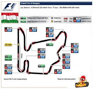 布達佩斯的匈格羅寧賽道原本全長僅3.975公里,但是在2003年首次做了大幅的修改,賽道全長變成4.381公里,比賽圈數由原來的77圈減少為70圈。彎曲的賽道設計,使賽車的平均速度高不起來,屬於中低速型賽道,這對輪胎的磨耗是相當的大,因此車隊的Pit stop通常會採取兩停的策略。由於布達佩斯大獎賽通常是在炎熱的夏季比賽,這對於賽車與車手都是一種炎熱高溫下的蒸熬,特別是車手坐在溫度高達50度左右的駕駛座艙內,感受可想而知。但車手在比賽的過程中,還必須要一直地保持高度的注意力集中。