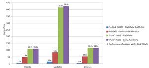 在一些對回響時間要求極其嚴格的場合,比如電信運營,工業控制,航空醫療等等,IMDB是最佳選擇。隨著記憶體價格越來越偏移,IMDB在新千年初期開始被大量使用,尤其在數據分析領域。幾年來,非易失性記憶體得到高速發展,更是使得IMDB可以實現本地持久化,逐漸脫離了緩慢的磁碟。NVDIMM作為非易失性記憶體中異軍突起的一員,相比其他一些方案的非易失性記憶體,速度快,容量高,成本低,實為IMDB的最佳存儲介質。引入NVDIMM技術後,IMDB將會以最大馬力馳騁於眾伺服器中,並且能夠在系統掉電時維持數據。美國mcobject公司宣布已成功將eXtremeDB移植於Agiga公司的NVDIMM產品,並公布了其基準測試結果。該測試包括“終止執行”,證實了AGIGA的NVDIMM產品在系統故障時持久存儲數據的能力,並促進數據恢復。下圖所示為插入,更新與刪除操作的測試結果。