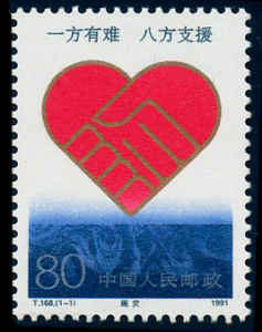 此套郵票共1枚,圖案採用抽象的象徵手法,以兩隻手緊握的金色線條構成紅色心形圖案,鮮明地表達了災害面前神州大地處處伸出的溫暖之手,處處跳動著中華兒女的赤子之心。郵票下部用一種抽象的暗藍色代表各種災害,更加襯托紅心的強烈視覺衝擊力,並將“一方有難,八方支援”八個字設計在郵票上端,使賑災主題更加明確、突出。