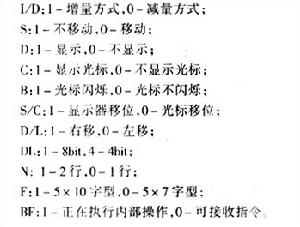 TC1602A的控制指令共11條,其中9條是針對命令暫存器IR的,另外2條是針對數據暫存器DR的,具體指令如表1所列。需要說明的是:表中*表示可以為0或1,表中的相關命令字設定如下: