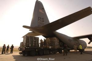 C-130的貨艙門採用了上下兩片開啟的設計,能在空中開閉;在空中艙門放下時是一個很好的貨物空投平台,尤其是掠地平拉空投的時候,在地面又是一個很好的裝卸坡道。而且該艙門也是整機氣密結構中的重要一環。各種C-130的貨運型都可以貼地投放11,000千克重的貨物。投放時,飛機貼地飛行,後艙門打開,首先拖出一個鉤子,鉤子的另一端與貨盤和貨物相連,當鉤子與地面空投場上的鋼索嚙合時,貨物就被從後艙門拖出。由於貨盤有能量吸收系統,貨物滑行30米後停下。當貨物超過22,000千克時,需要使用條帶降落傘將貨物從貨艙中拖出。
