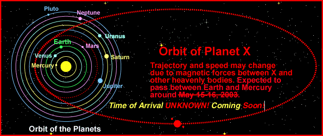 而事情的真相是,當初的發現並沒有錯誤,他們事後的澄清才是錯誤。那顆所謂的planetX就是Nibiru,這顆巨大的行星老早就已經被我們老祖宗發現了並被記錄在古文獻之中。它是另外一個臨近太陽系的最外圍行星,它超級闊大的軌道使它大約每3600年會進入我們這個太陽系一次。所以,它已經不是第一次光臨我們這個太陽系了。地球歷史上的巨大災難(如恐龍滅絕)的導因猜測都是這顆巨大的行星引起的。